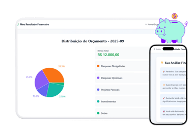 👉 Em segundos, você recebe um gráfico visual completo da distribuição do seu orçamento e sugestões personalizadas.